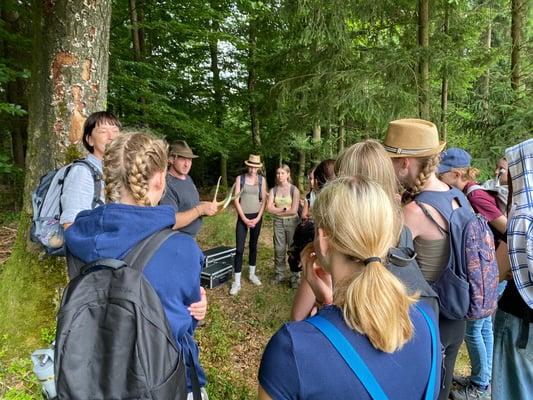 Diese fanden sich nach einer 30 minütigen Busfahrt im Jagdrevier von Flo ein. Kaum angekommen folgte eine Frage auf die Nächste.... Florian erklärte den Lebensraum des Bibers, gab Einblick auf das Verhalten von Schwarzwild und was für ein gesundes Ökosystem wichtig ist. Der heimliche Star des Tages war allerdings Dackel Rudi. Dieser veranschaulichte die Aufgaben eines Jagdhundes und stand natürlich bei allen "Streicheleinheiten" seinen Hund! Andrea Sauer von AELF war ebenfalls beim Termin mit dabei. Sie erklärte den Mädchen was es im Wald alles zu entdecken gibt und stellte den Beruf des Försters vor.